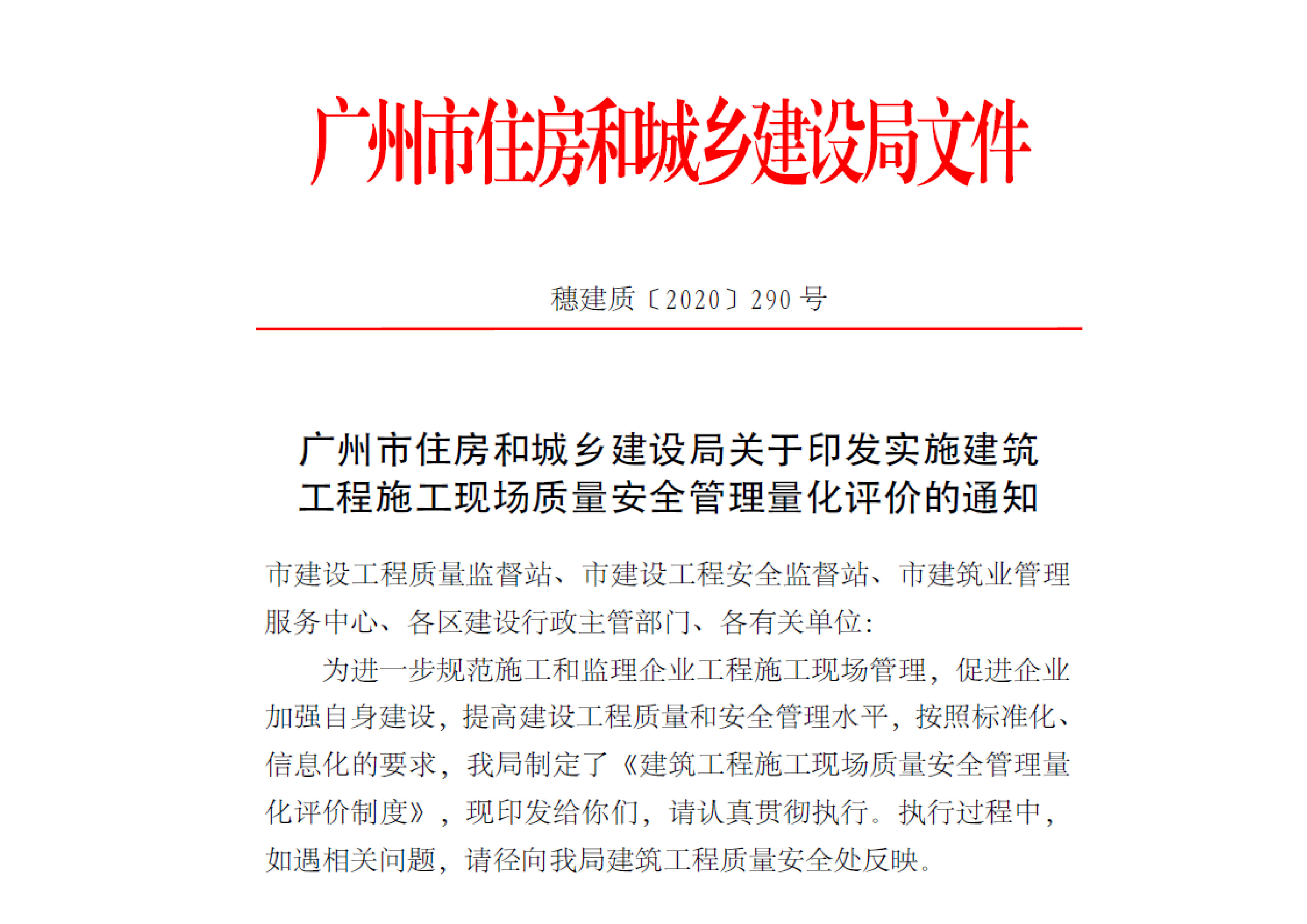 廣州市住房和城鄉(xiāng)建設(shè)局關(guān)于印發(fā)實施建筑工程施工現(xiàn)場質(zhì)量安全管理量化評價的通知